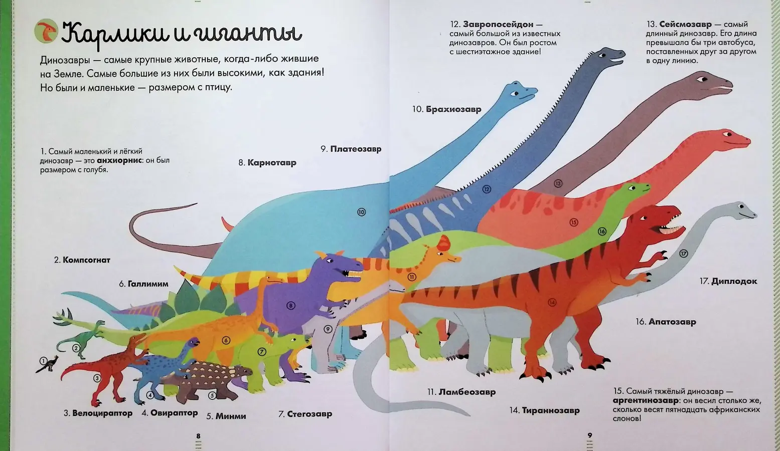 Кто был самым длинным, а кто — размером с кошку? У кого на голове красовался костяной шлем, а чья шея достигала семи метров? В книге собрана подробная информация о семействах динозавров, их рационе, повадках и способах защиты. Дети узнают не только о сухопутных гигантах, но и о тех, кто парил в небесах или скрывался в океанских глубинах. Книга развивает кругозор и пробуждает интерес к естественным наукам.