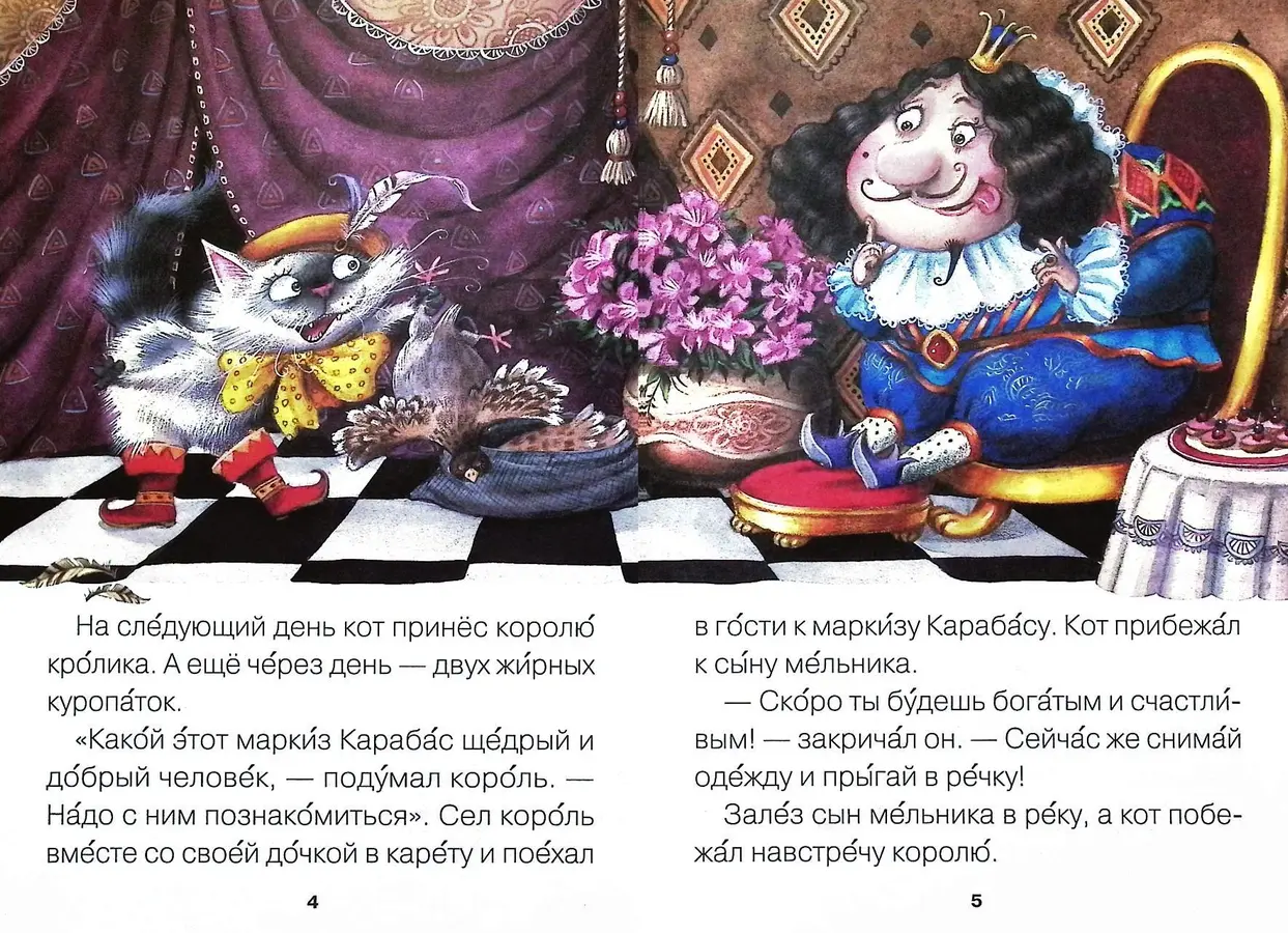 Знакомая история о приключениях находчивого и предприимчивого Кота в сапогах увлечёт маленького читателя с первых страниц. А чтобы процесс чтения был максимально комфортным и приносил только радость, эта книга продумана до мелочей.