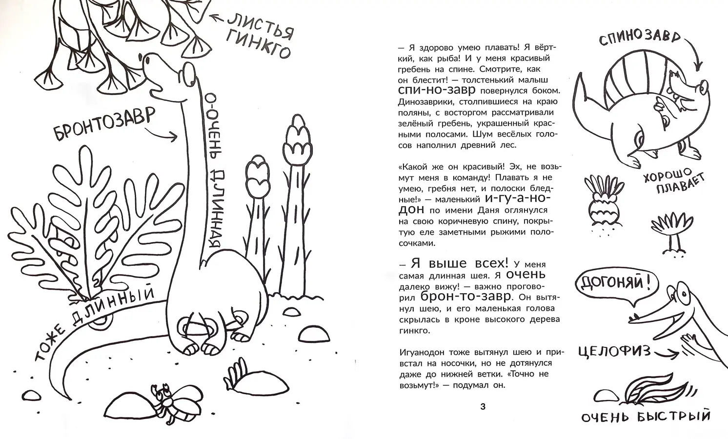 Мы познакомимся с маленьким игуанодоном Даней. Он очень хотел попасть в команду "самых-самых", но, увы, не умел ни плавать, ни громко гудеть. Даня уже почти поверил, что он просто неумеха, как вдруг... его друг-птеродактиль помог ему обнаружить у себя совершенно особенный "рисовальный" коготь!