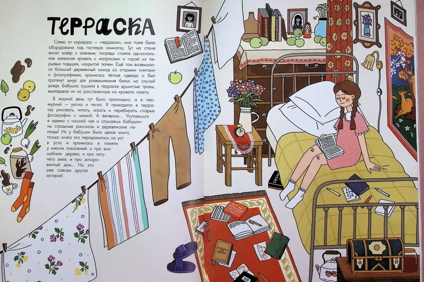 В этой иллюстрированной книге (можно сказать, книге-воспоминании) мы словно листаем старый семейный фотоальбом: заглянем в большой уютный дом, узнаем о предметах быта и традициях не такого уж далекого прошлого. Благодаря тому, что Евгения Кишмария сама создала и текст, и чудесные иллюстрации, книга получилась очень искренней и атмосферной.