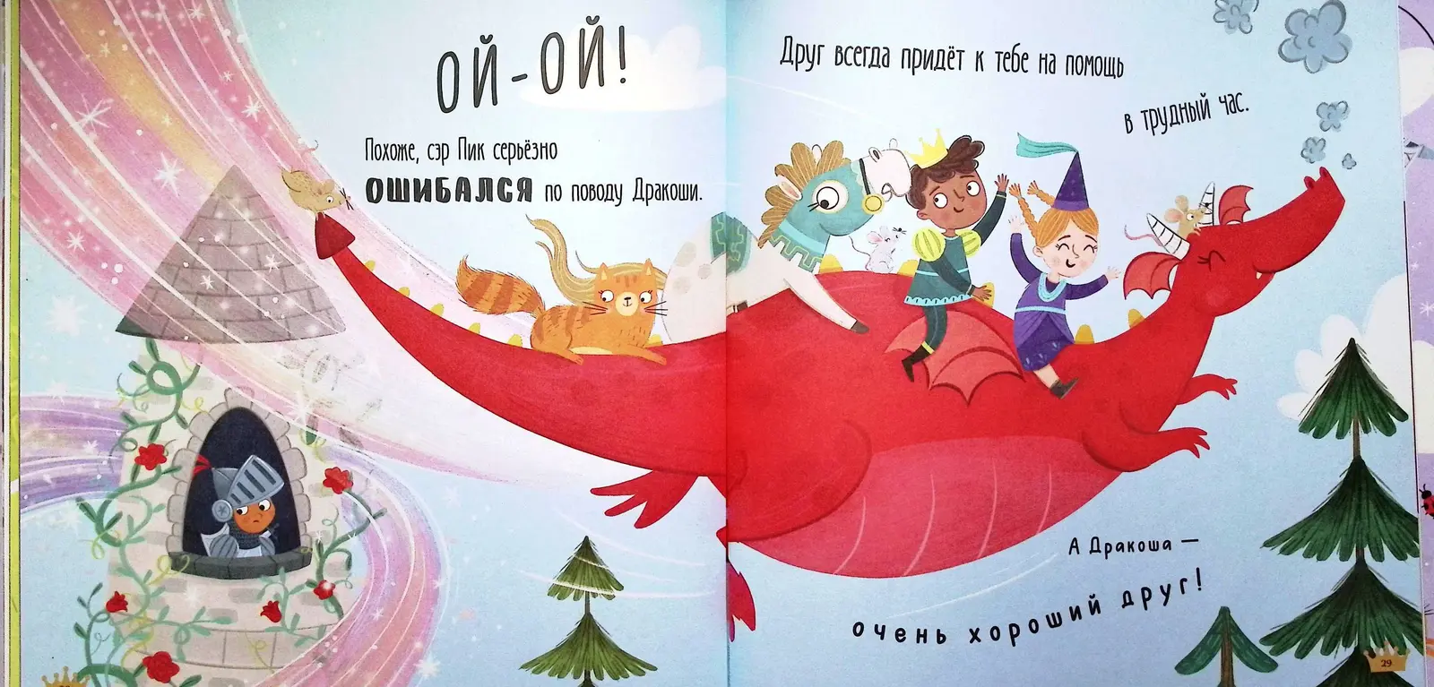 Книгу придумала Бьянка Шульц, а волшебные иллюстрации нарисовала Самара Харди. Их совместная работа помогает обсудить с ребенком, что первое впечатление бывает обманчивым, и учит приходить на помощь в трудную минуту. Ведь если уж рыцари и драконы могут стать друзьями, то это под силу каждому!