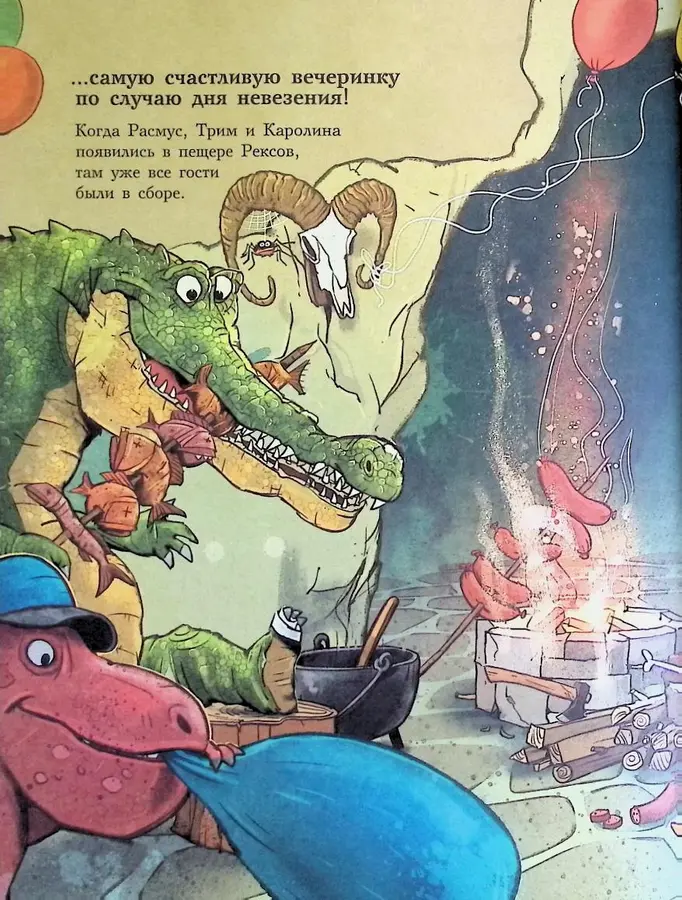 Утро у Расмуса Рекса явно не задалось: только проснулся – поскользнулся, хотел встать – провалился в подвал! Что за напасть? Ах да, сегодня же Пятница, 13-е – самый невезучий день! Но его лучший друг Трим Троодон знает, как прогнать все несчастья.