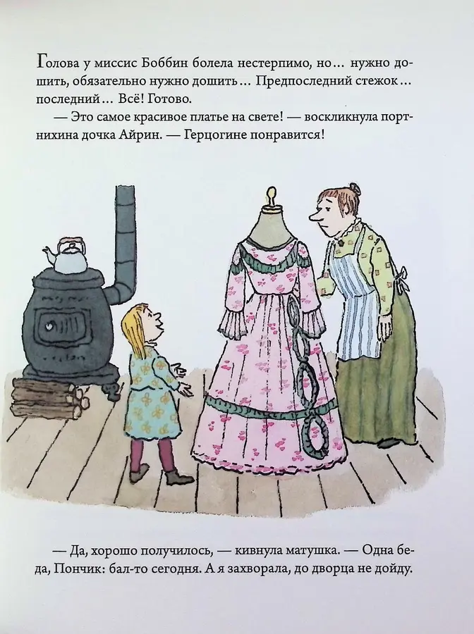 Портниха миссис Боббин много дней трудилась над бальным платьем герцогини, но, закончив работу, заболела от усталости. А бал уже сегодня! Хорошо, что у нее есть дочка Айрин, которая всегда готова позаботиться о маме.