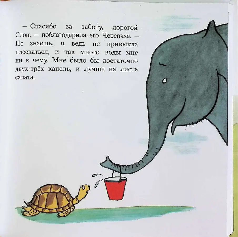 У Черепахи была мечта – получить на день рождения кочан салата. Но друзья дарили ей то, что понравилось бы им самим: Лев – мясо, Слон – воду, Пеликан – рыбу. Добрая Черепаха благодарила всех и предлагала угоститься. И лишь Мышка угадала желание! Эта история учит быть внимательным к желаниям других и показывает, что дружелюбие и искренность вознаграждаются.