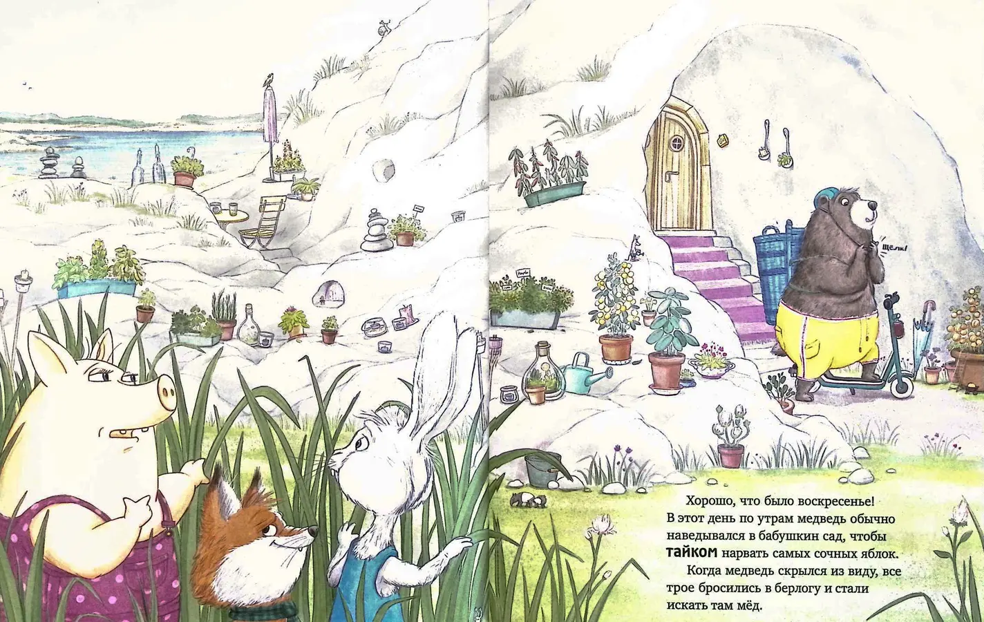 В этой сказке встретились два любителя вкусно поесть: Медведь и Свинка. Свинка напекла блинов, но для полного счастья ей не хватает мёда. А у Медведя как раз есть мёд, но нет блинчиков! Что же они придумали? Конечно, стащить друг у друга недостающие лакомства! Что из этого вышло, вы узнаете из этой смешной истории.