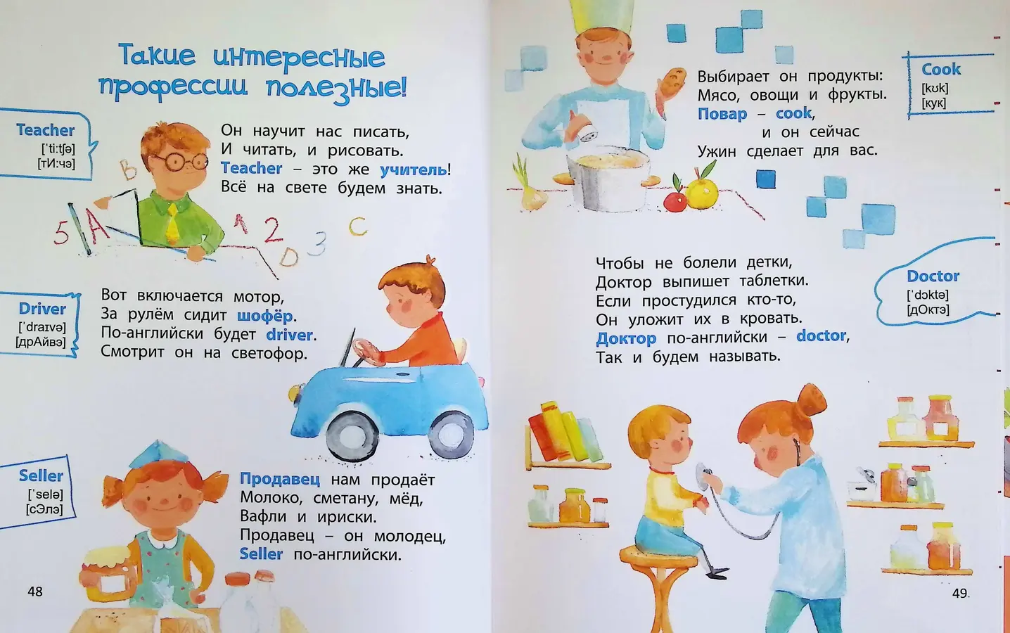 Эта книга помогает в игровой форме запомнить первые английские слова, развивает память и вызывает у ребенка позитивные ассоциации с изучением нового языка.⭐