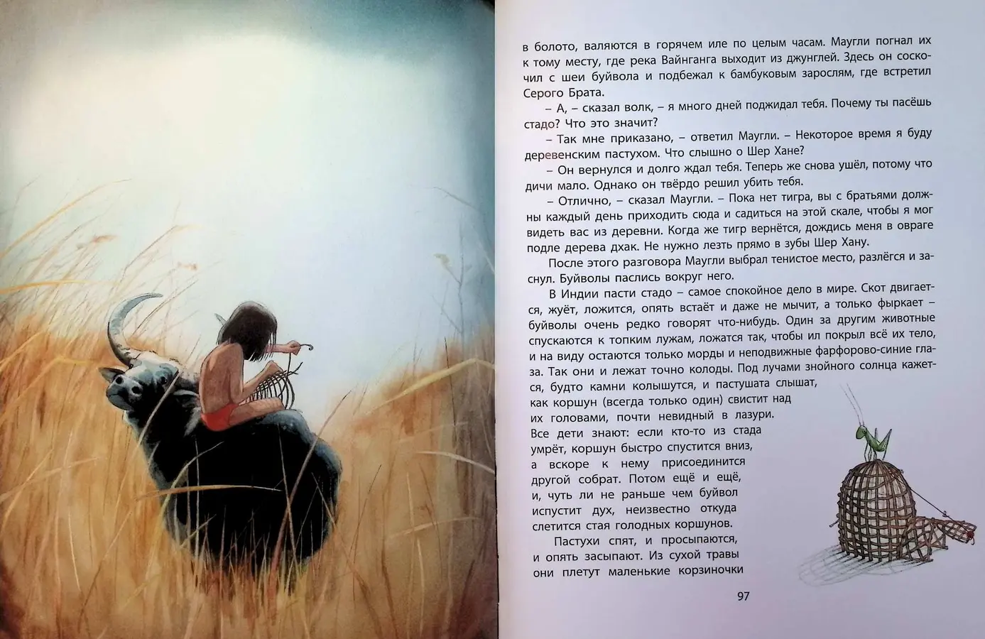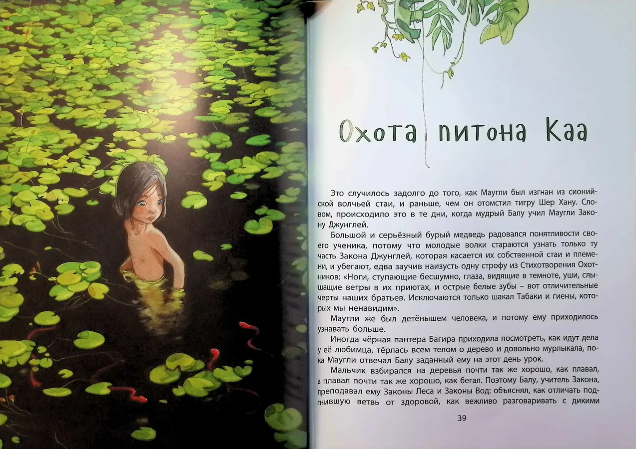 Настоящим сокровищем этого издания являются иллюстрации знаменитого бельгийского художника Квентина Гребана. Его уникальная манера — сочетание насыщенных акварельных заливок и четких карандашных контуров — придает образам невероятную динамику и легкость. Благодаря его мастерству дикие джунгли и их обитатели буквально оживают на страницах книги, делая приключения Маугли еще более захватывающими.