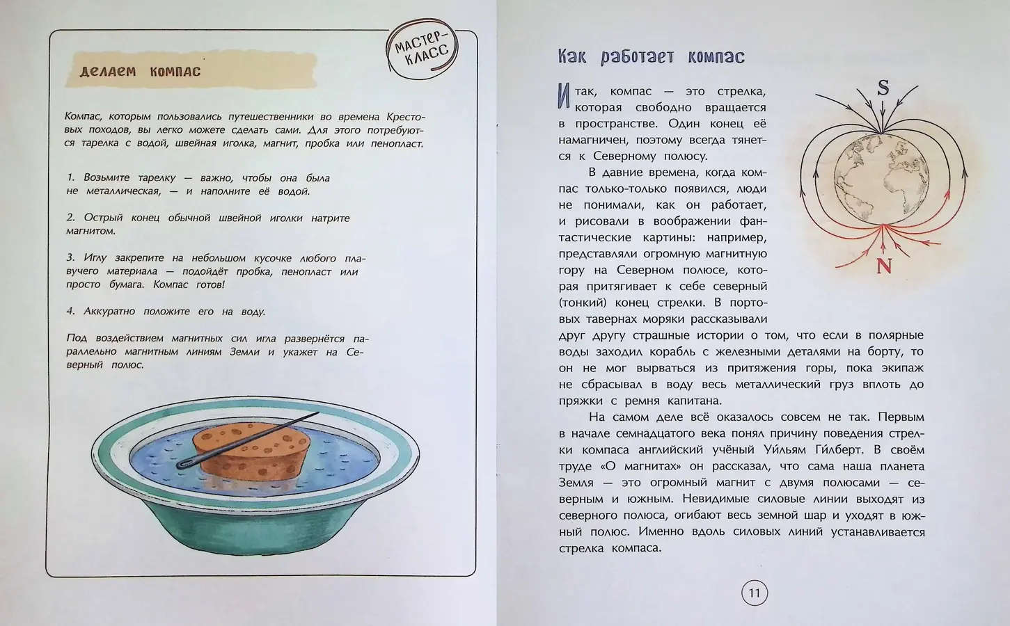 Самое интересное: в книге есть пошаговое руководство, которое поможет вам **сделать компас своими руками**! Это познавательное руководство развивает знания о магнетизме, географии и практические навыки, вдохновляя на собственные приключения.