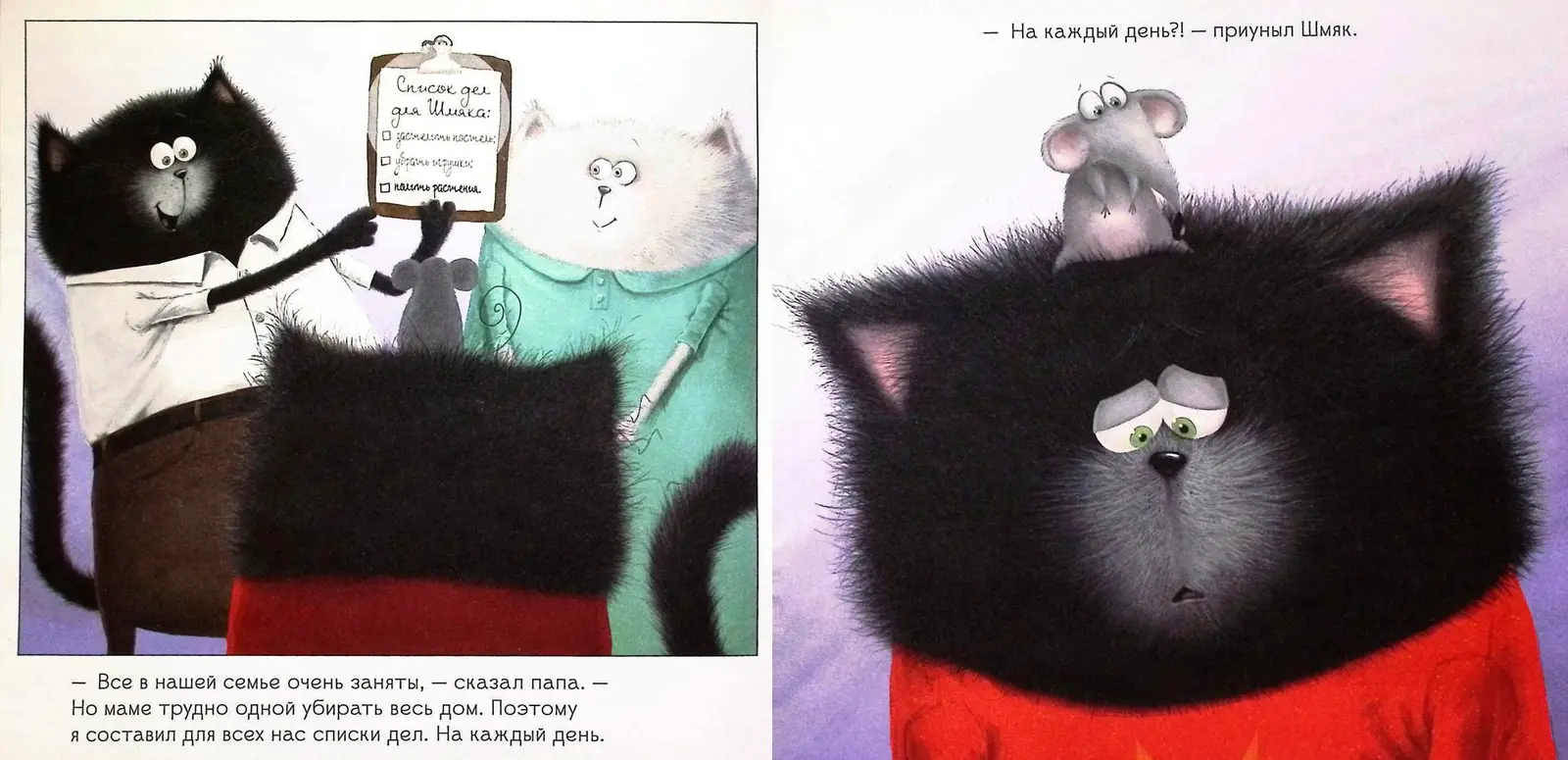У котёнка Шмяка сегодня много домашних хлопот: убрать игрушки, застелить постель, полить цветы… Ну что может быть скучнее? Но наш находчивый друг знает секрет! С помощью капельки фантазии скучная обязанность превращается в невероятное приключение. Комнатные растения становятся дикими джунглями, которые нужно спасти от засухи, а разбросанные игрушки — пиратскими сокровищами для тайника!