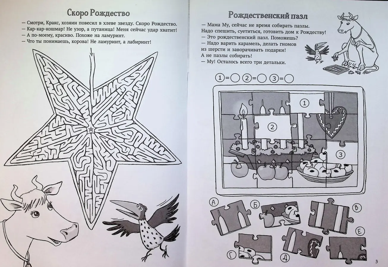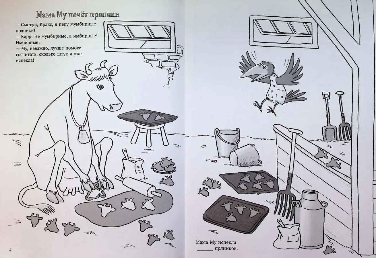 Присоединяйтесь к самой необычной корове в мире и её ворчливому, но изобретательному другу ворону Краксу! В этой книге заданий вас ждут настоящие праздничные приключения: помогите Маме Му найти дорогу в «ламуринте», сосчитайте все «мумбирные» пряники и раскрасьте хлев для празднования дня святой Мусии.