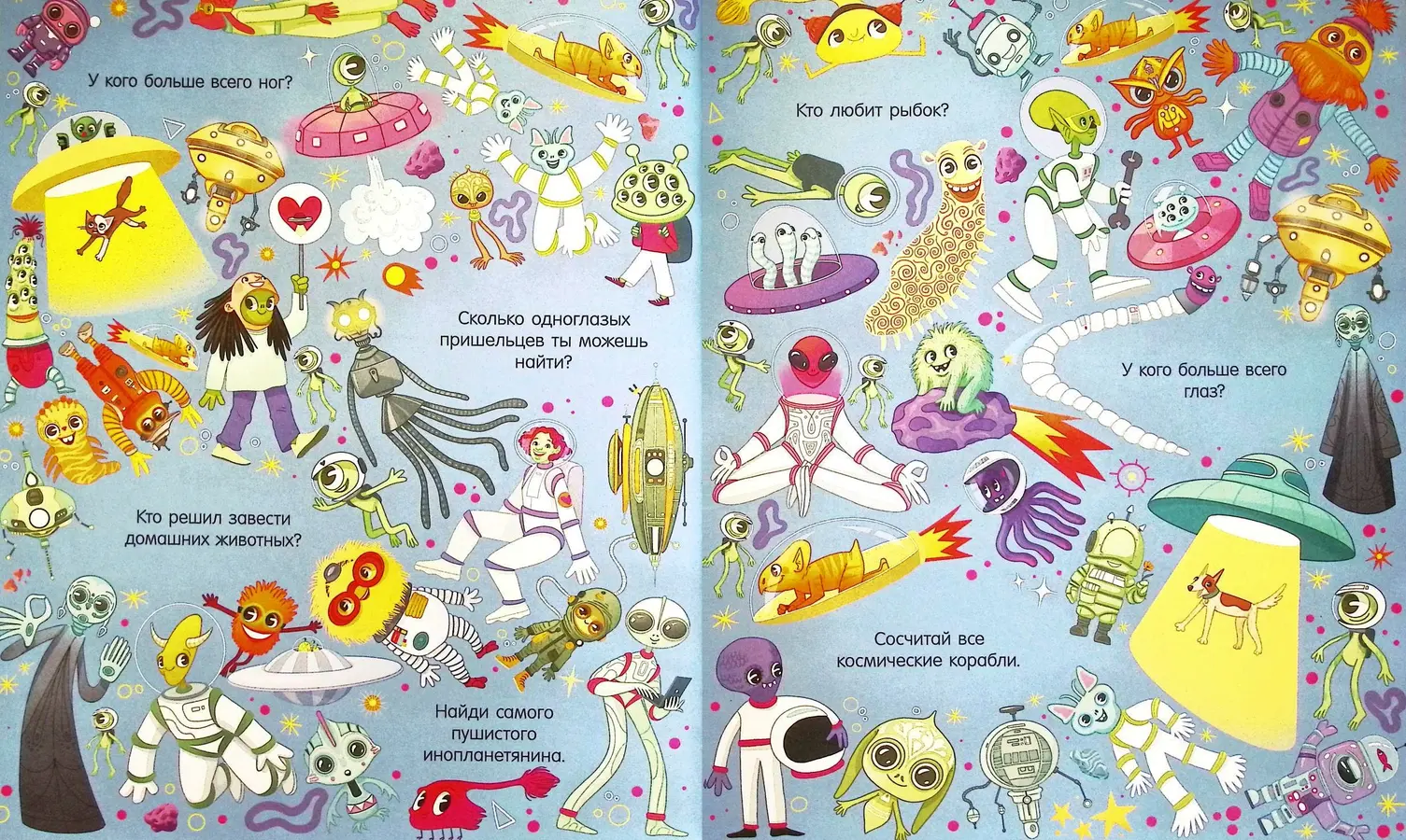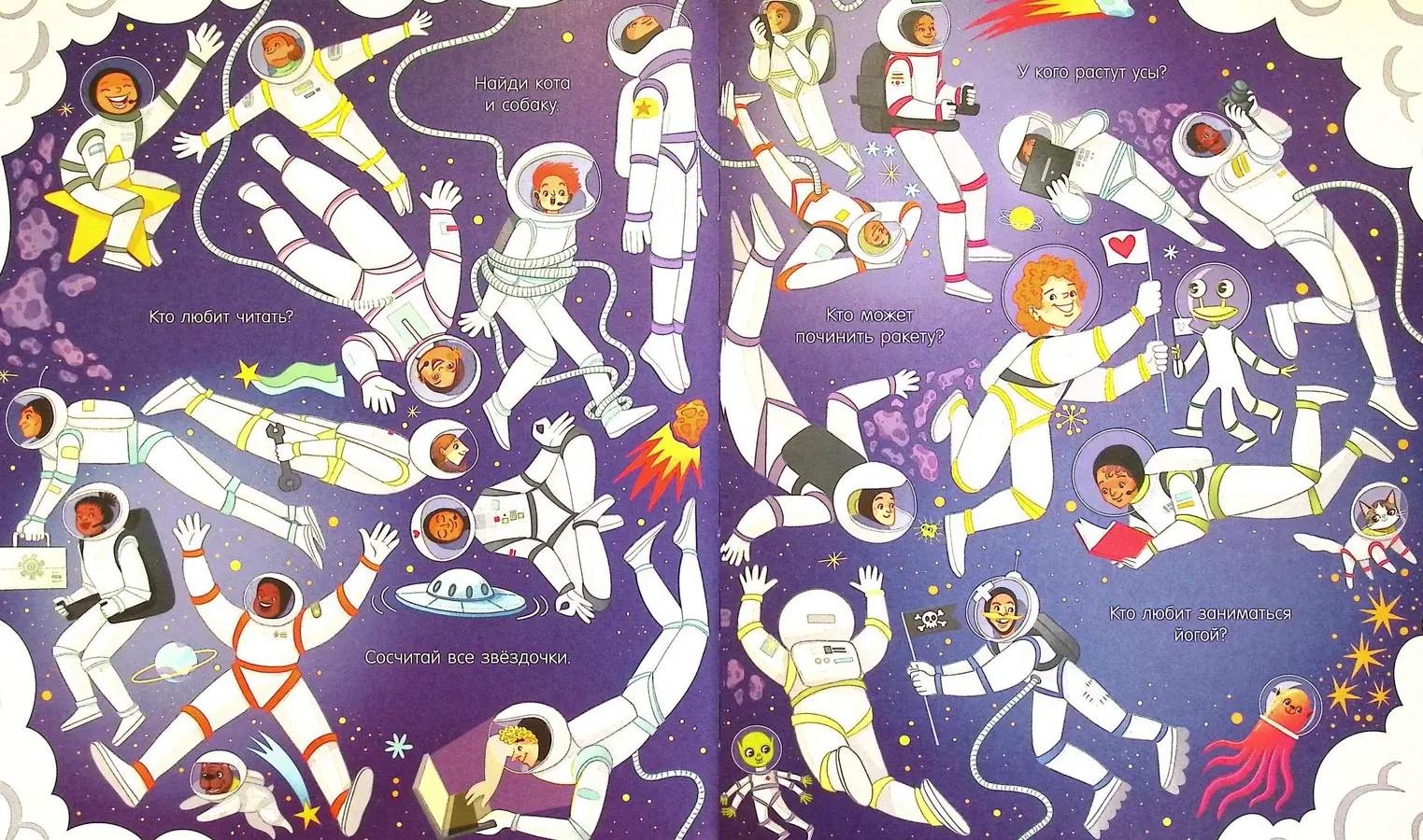 На каждом развороте вас ждут великолепные, полные деталей иллюстрации от Анастасии Дружининской. Вместе с ребёнком вы сможете заглянуть внутрь ракеты, узнать, как живут космонавты на орбите, и даже познакомиться с забавными инопланетянами. А сможете найти всех котиков, которые спрятались на страницах? 🚀