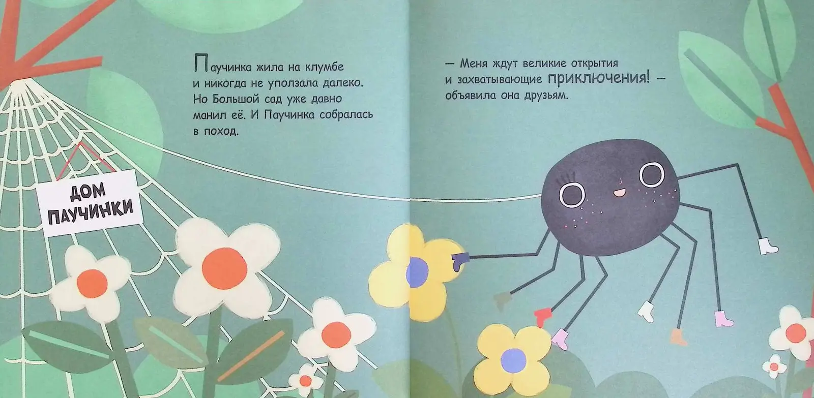 Маленькой Паучинке надоело сидеть на клумбе, и она смело отправляется навстречу приключениям в Большой сад! Ее друзья – Гусеничка, Божья Коровка и Шмелик – предупреждают об опасностях, но отважная героиня никого не слушает.