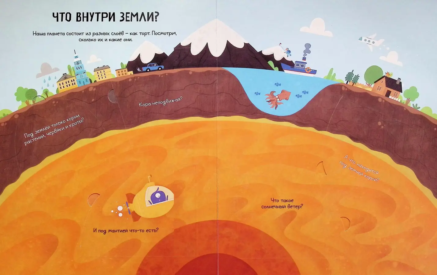 Как появилась наша планета и что скрывается глубоко под земной корой? Эта интерактивная энциклопедия приглашает детей в захватывающее путешествие от центра Земли до самых высоких горных пиков. Благодаря секретным окошкам-клапанам, процесс познания превращается в игру, которая надолго увлекает юных исследователей.