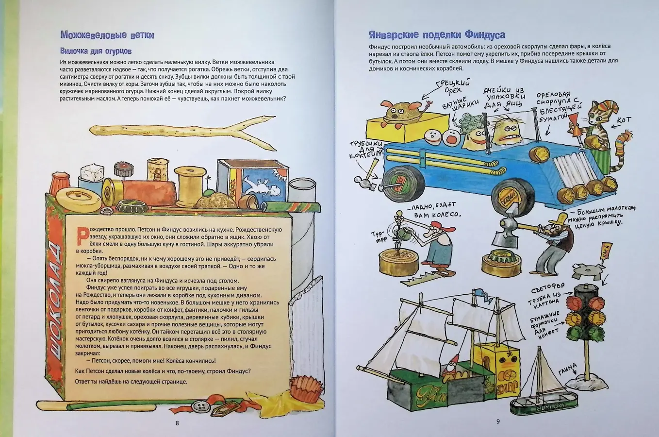 Старик Петсон — мастер на все руки, а его котёнок Финдус обожает придумывать! Эта чудесная активити-книга — настоящий кладезь идей для занятий, которые можно сделать дома.