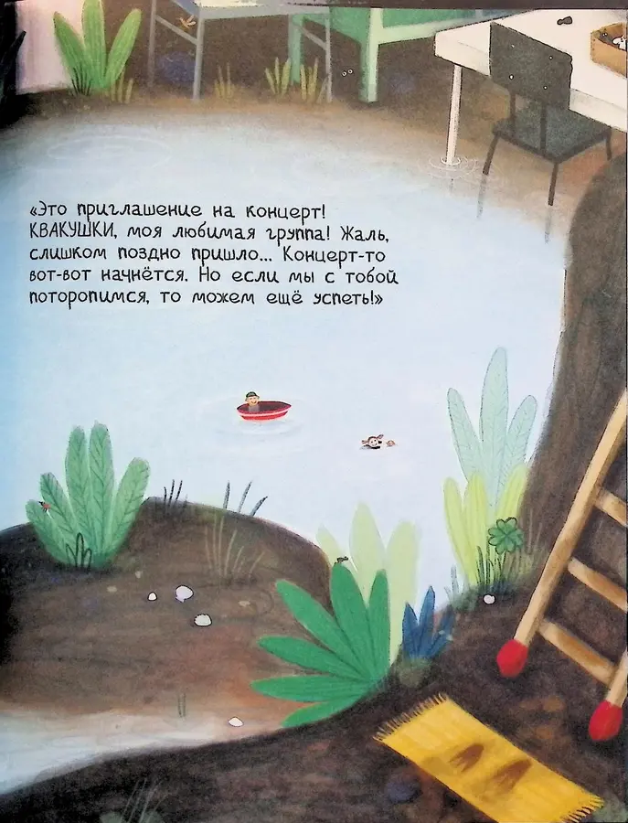 Лягушонок Стёпка вместе с папой отправляется на грандиозный Квакающий рок-концерт. Время поджимает, и нужно идти очень быстро, чтобы не пропустить начало. Однако для маленького героя путь превращается в череду удивительных открытий. Эта книжка-картинка, созданная талантливой художницей Лус Рифаген, приглашает читателей в мир, где каждая мелочь имеет значение.