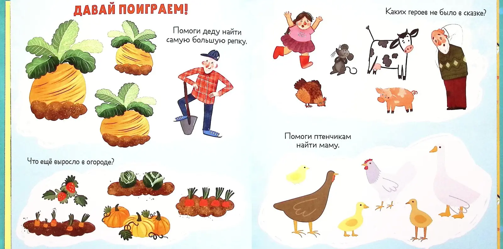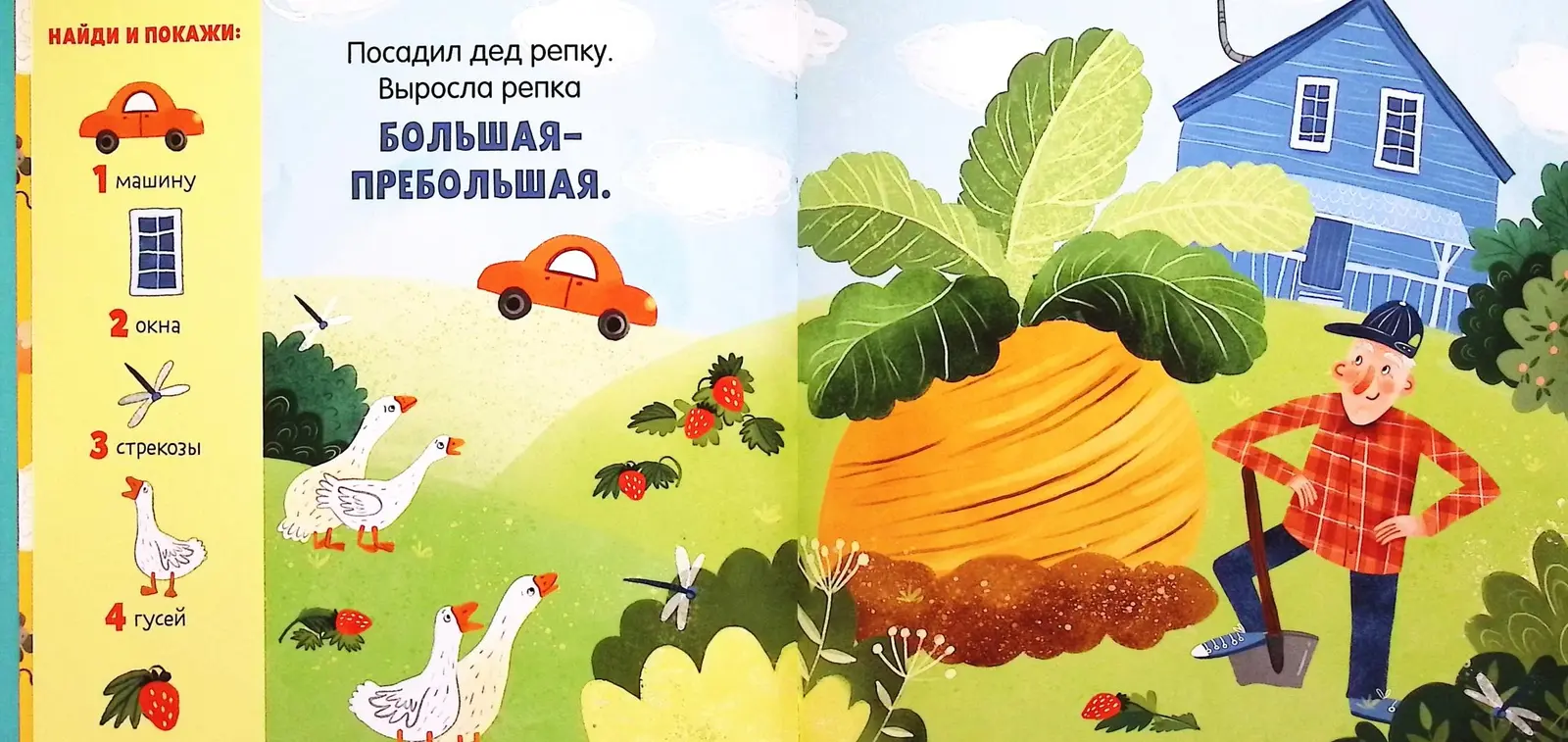 Хотите, чтобы первое знакомство вашего ребёнка с «Репкой» стало настоящим приключением? Эта книга превращает классический сюжет в захватывающую игру. На каждой странице вас ждут не только знакомые герои, но и множество забавных деталей, спрятанных предметов и заданий.