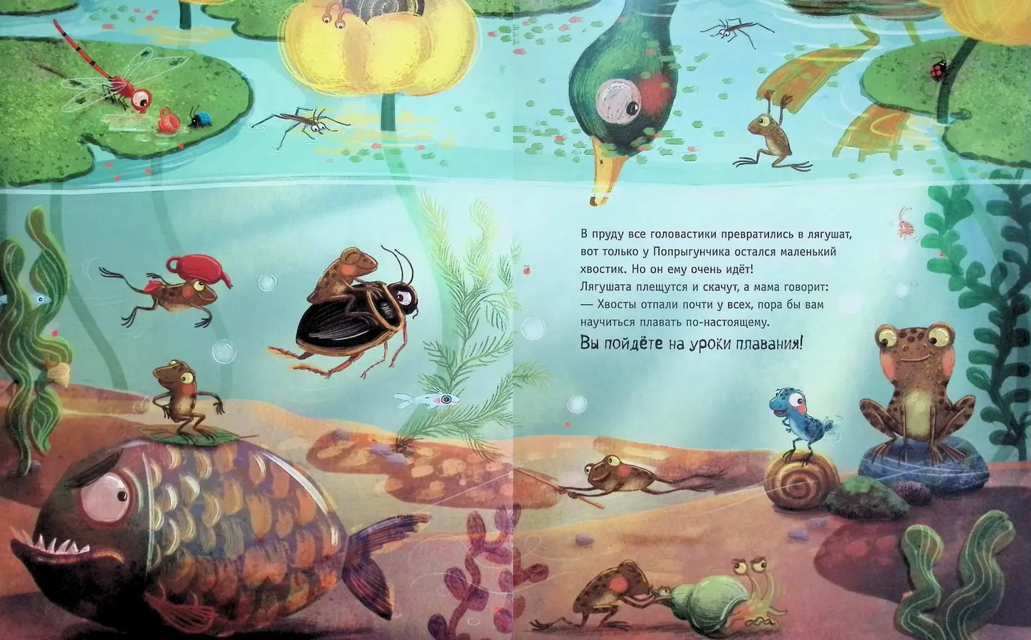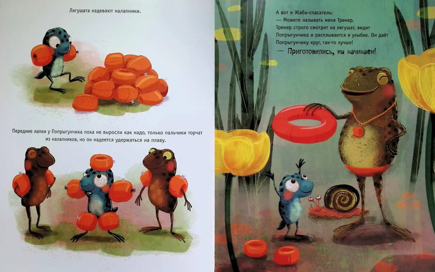 Плюх! Еще вчера они были головастиками, а сегодня – уже настоящие лягушата! А это значит, что пришла пора отправляться в школу плавания. Все малыши готовы к урокам.
