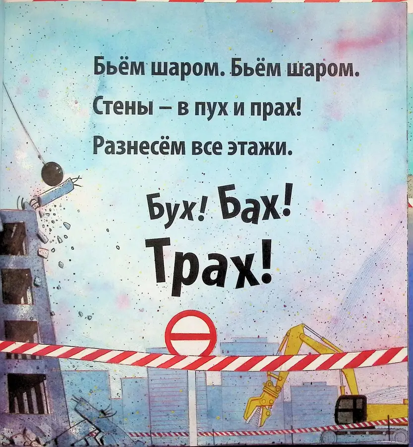 Снести огромное здание — задача не из легких. Здесь не обойтись без подъёмного крана с тяжёлым шаром-молотом и стальных челюстей экскаватора, которые делают «Кусь! Хрусь! Хруп!». Книга развивает чувство ритма и фонематический слух благодаря обилию звукоподражаний, которые так нравится повторять детям от 2 до 4 лет.