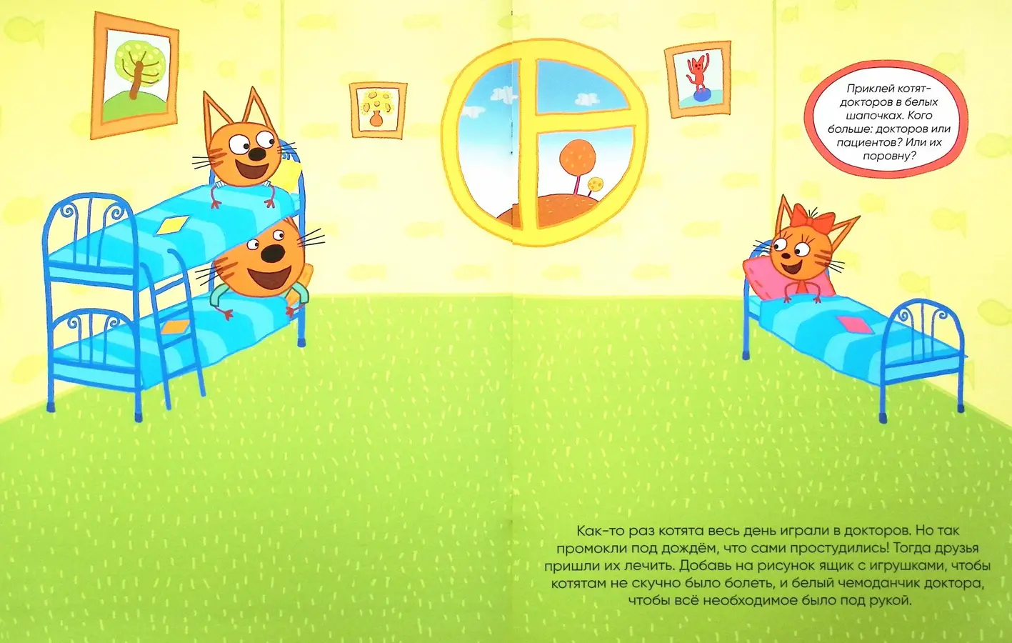 На её страницах маленького читателя ждут любимые герои — Коржик, Компот и Карамелька, а также увлекательные задания. Ребёнку предстоит помочь котятам в их весёлых играх, распределяя яркие наклейки по страницам.