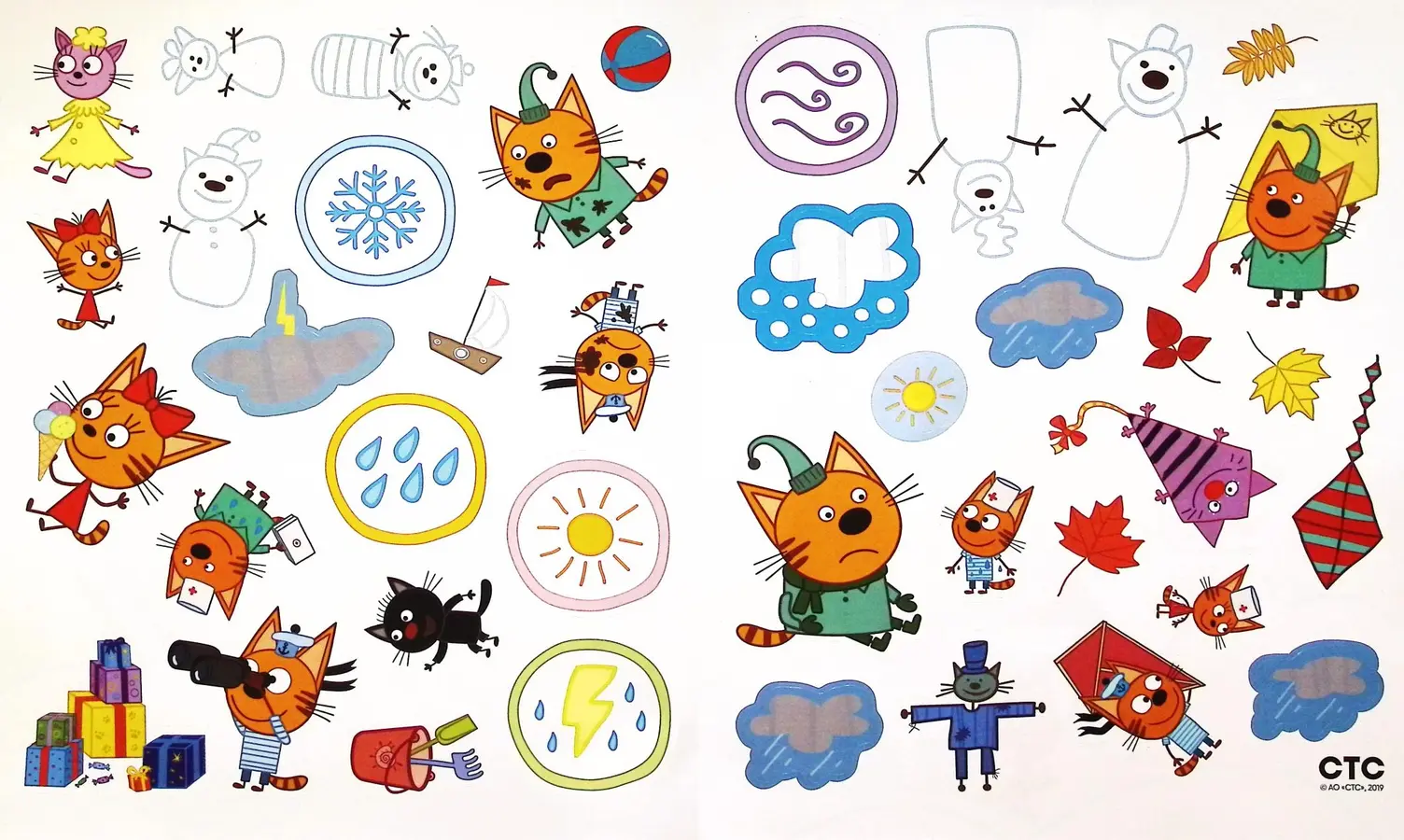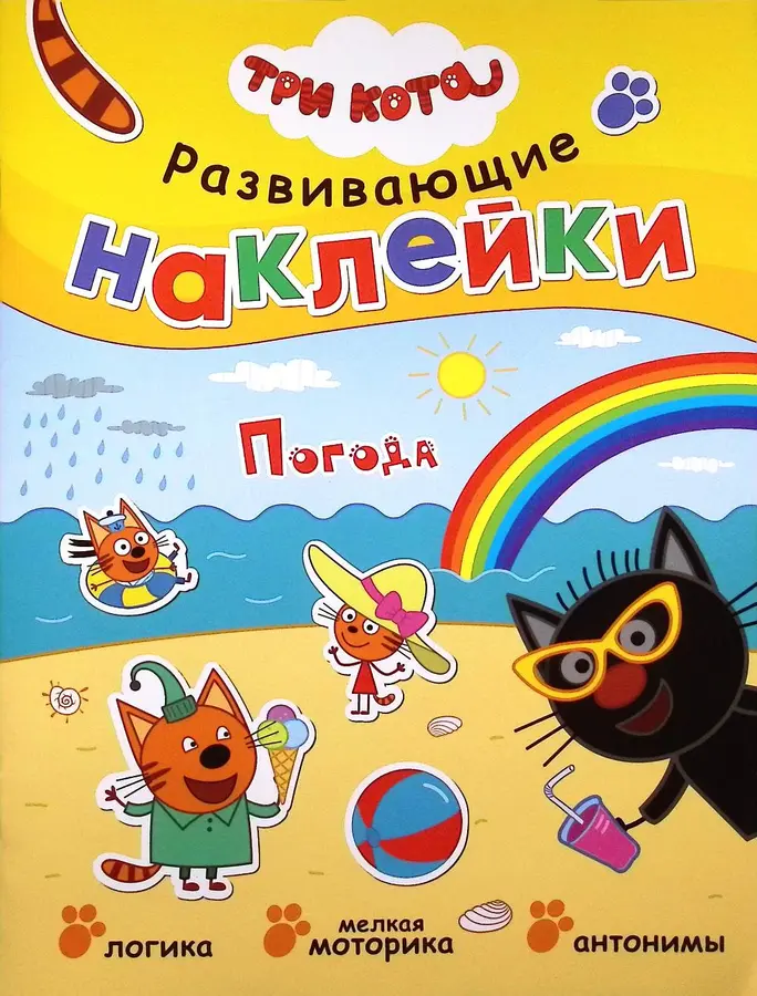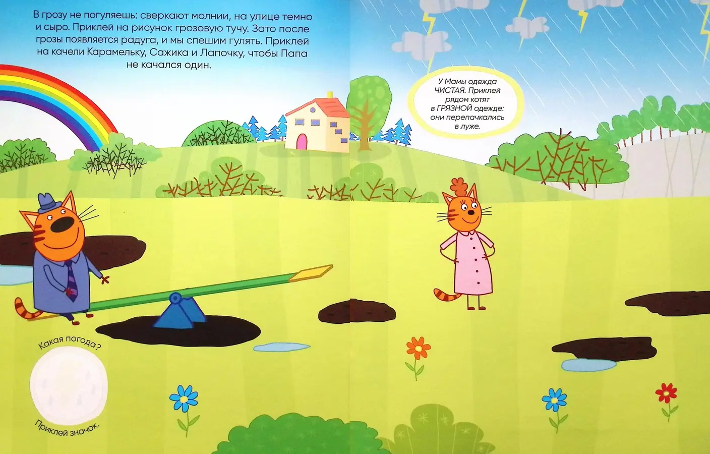 На её страницах маленького читателя ждут любимые герои — Коржик, Компот и Карамелька, а также увлекательные задания. Как одеться в дождик? Что бывает, когда светит солнце? Ребёнку предстоит помочь котятам, распределяя яркие наклейки по страницам.