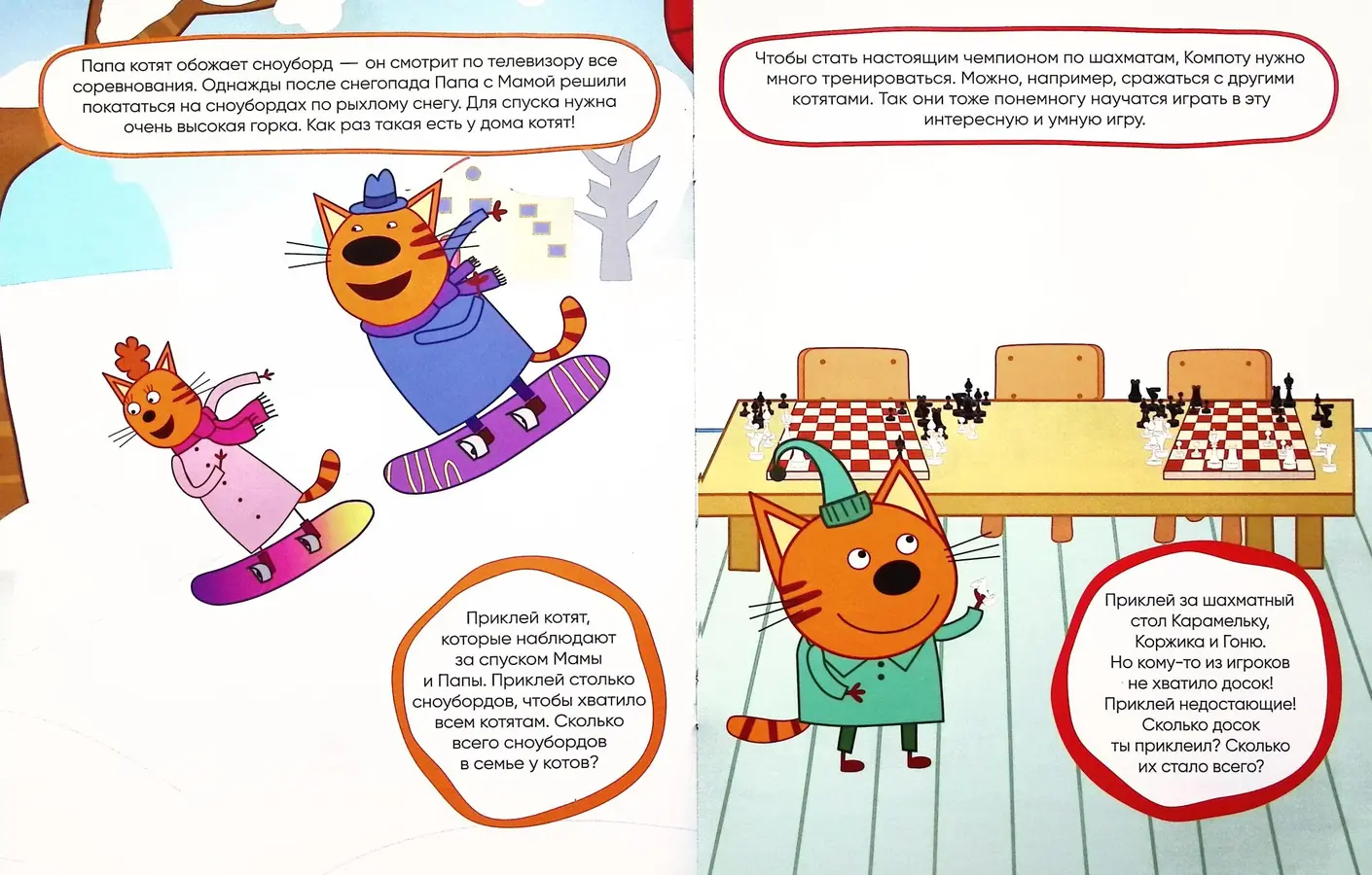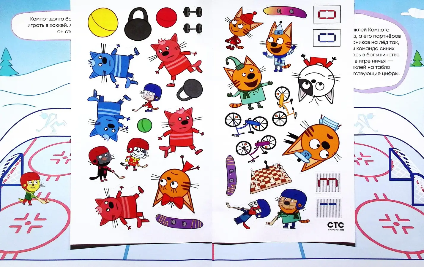 Внутри ребёнка ждут красочные развороты и множество наклеек с котятами и спортивным инвентарём. Нужно помочь Карамельке сделать зарядку, поиграть с Коржиком в футбол и покататься на велосипеде с Компотом!