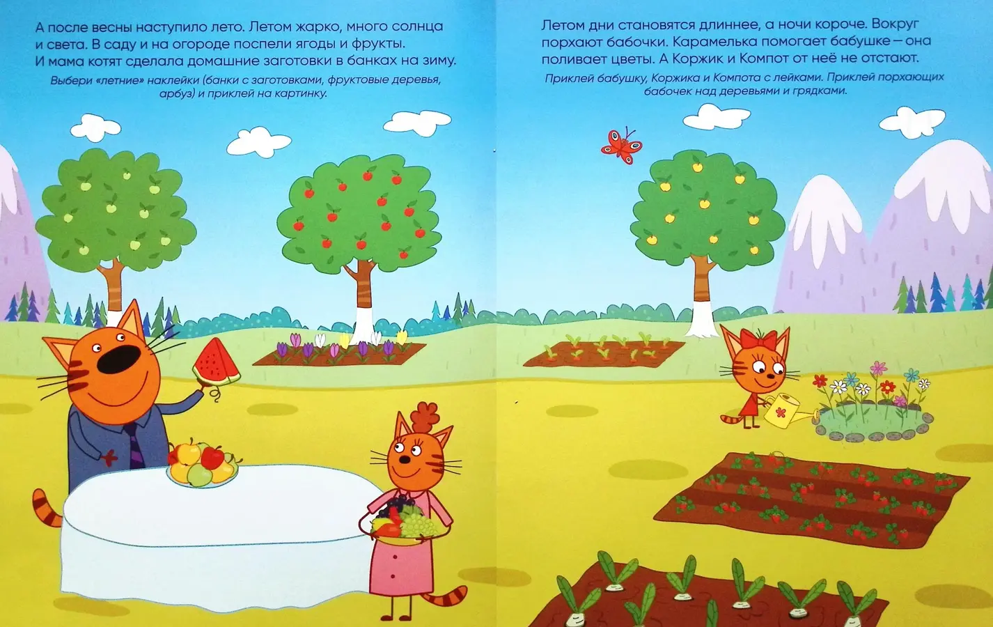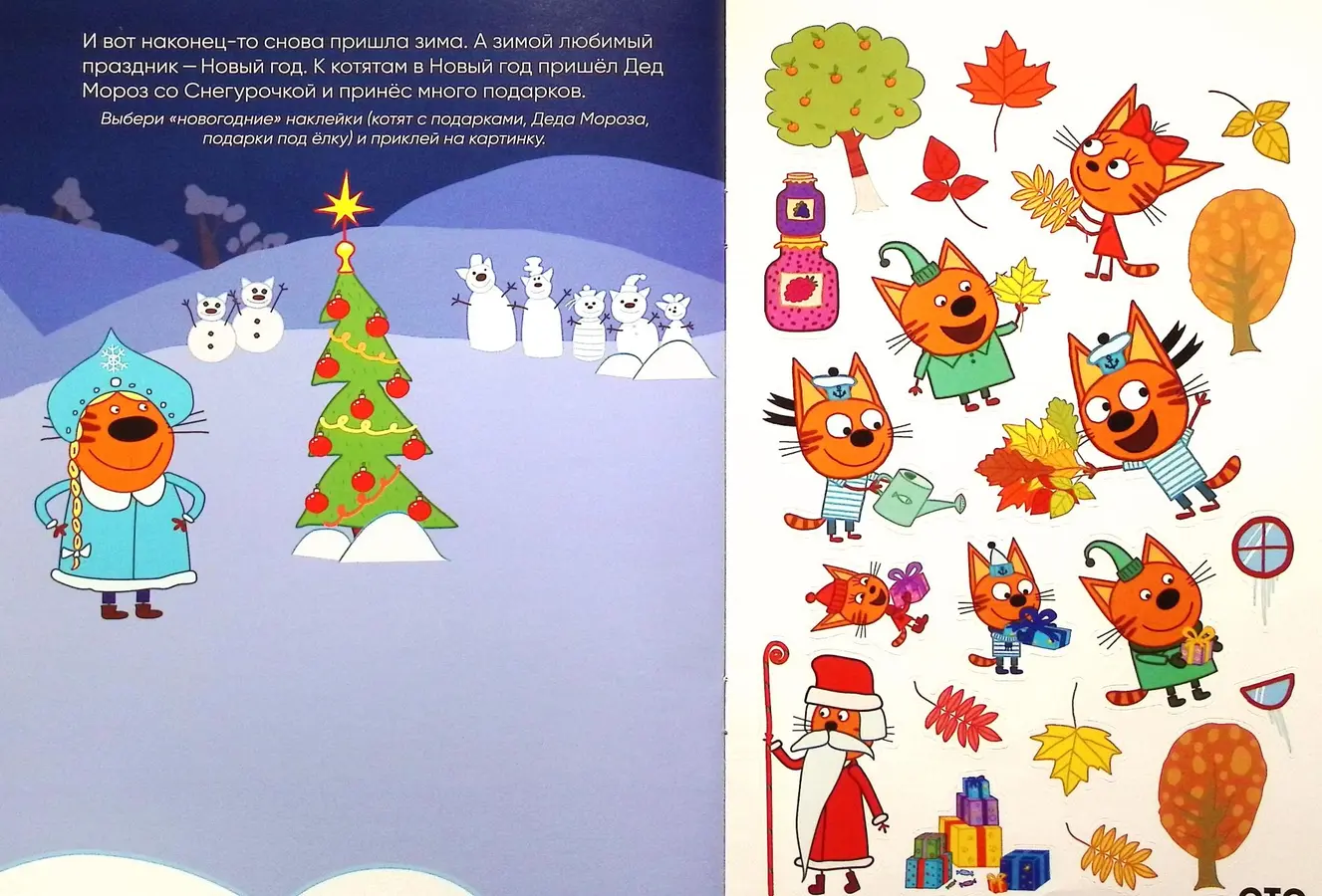 На её страницах маленького читателя ждут любимые герои — Коржик, Компот и Карамелька, а также увлекательные задания. Ребёнку предстоит помочь котятам разобраться, во что играть зимой, а что делать летом, распределяя яркие наклейки по страницам.