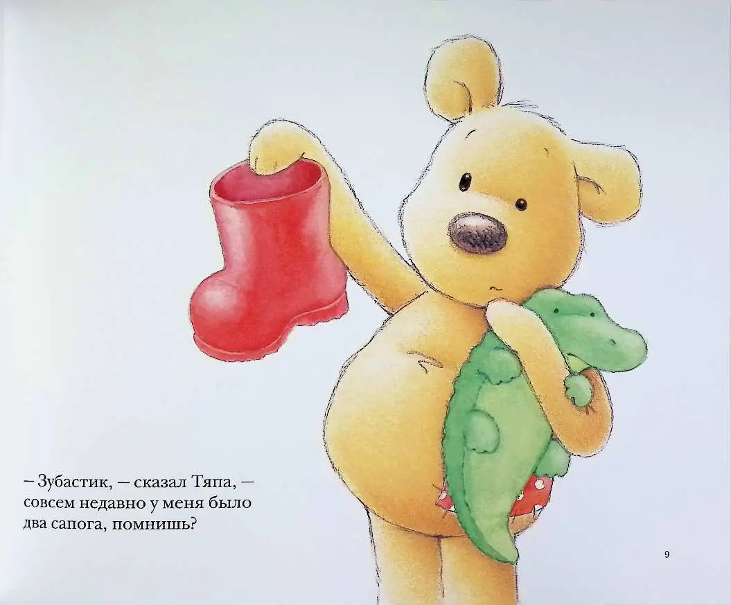 В поисках пропажи Тяпа превратил дом в полосу препятствий. Он провёл ревизию в каждой коробке, заглянул под каждый диван и устроил тотальный переворот в чулане. Сапог, конечно, нашёлся. Но, как это обычно бывает, решив одну проблему, Тяпа создал другую. В рукотворном хаосе бесследно исчез нечто гораздо более ценное — лучший друг, крокодильчик Зубастик!