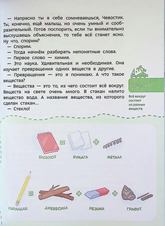 Из чего состоит всё, что мы видим вокруг? Почему грифель карандаша и сверкающий бриллиант — близкие родственники? Развивающая энциклопедия «Химия с Чевостиком» приглашает маленьких исследователей в захватывающий вояж сквозь пространство и время, чтобы разгадать самые интересные загадки материи.