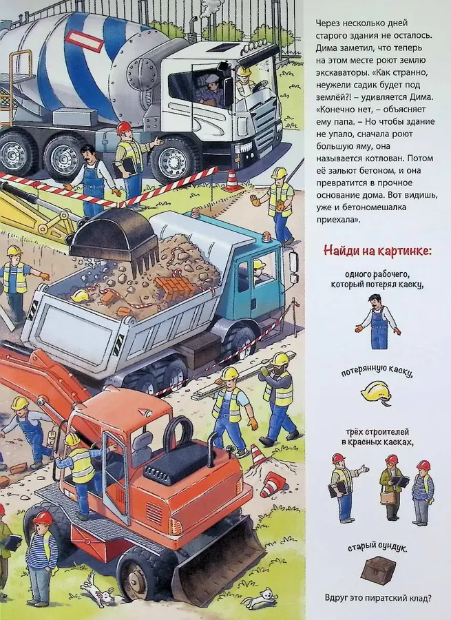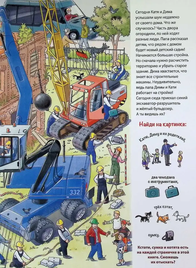 Вместе с Катей и Димой ваш ребёнок увидит, как много всего происходит на стройке! Здесь работают сильные машины, множество рабочих и используются самые разные инструменты. Задача маленького исследователя — внимательно рассмотреть каждую страницу и найти всё самое интересное.