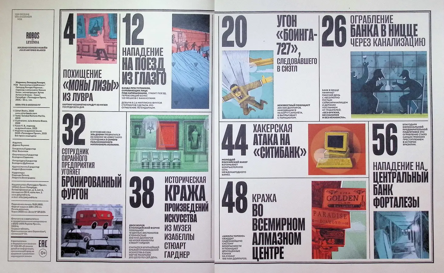 ... настоящая иллюстрированная хроника самых дерзких и изощрённых ограблений за последние 150 лет. Автор Соледад Ромеро Мариньо собрала истории, которые поражают своей изобретательностью, логикой и порой невероятной удачей.