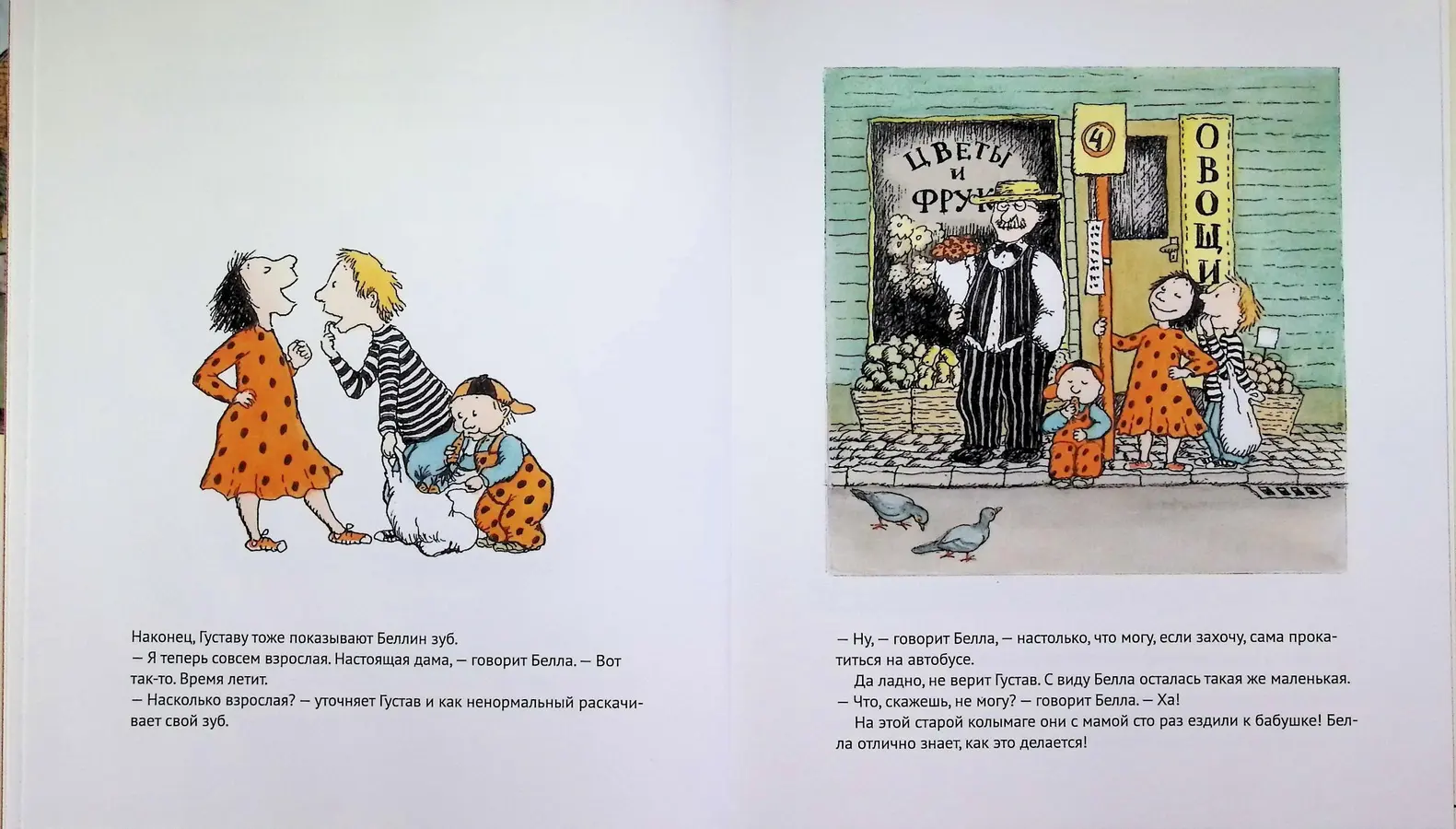 У Беллы знаменательный день — у неё наконец-то выпал первый зуб! Для каждого ребенка это важный символ взросления. Теперь Белла уверена, что она достаточно большая, чтобы самостоятельно поехать на автобусе к бабушке, взяв с собой младшего брата и верного друга Густава. Эта современная шведская сказка наполнена юмором и точным пониманием детской психологии.